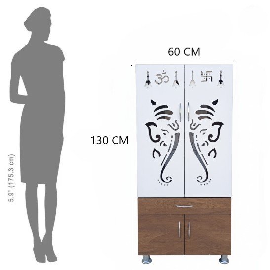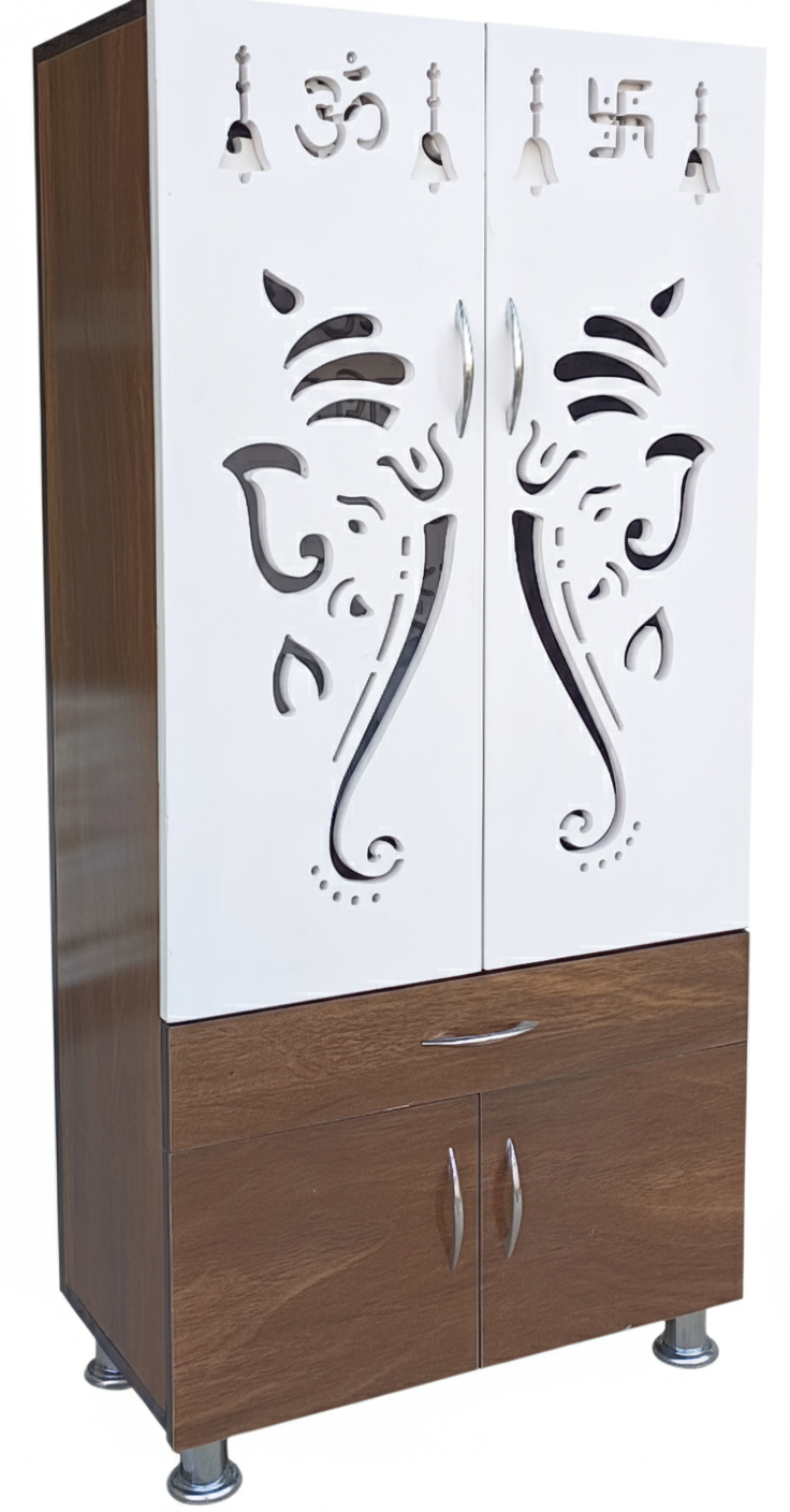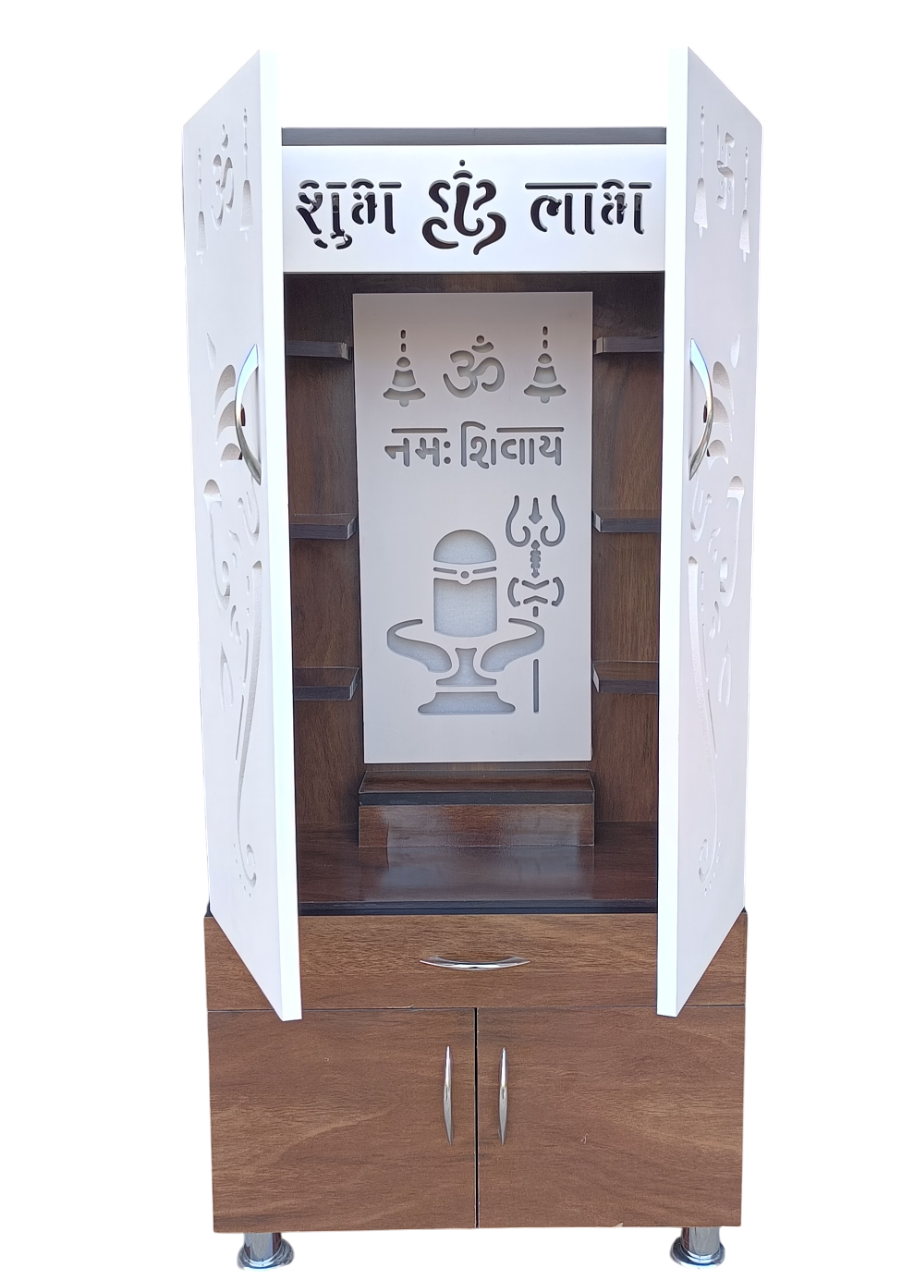 Deity: The central focus is a statue of Lord Shiva, seated in a meditative posture (padmasana), often depicted with blue skin, a crescent moon, and the third eye. Structure: The temple unit is a two-part cabinet: The upper section serves as the main worship area (garbhagriha), with two white, intricately carved doors that are currently open. The lower section is a darker wooden storage cabinet with doors, used for storing prayer accessories (puja samagri). Inscriptions/Symbols: Above the deity, there is decorative lettering and symbols in Hindi: “शुभ लाभ” (Shubh Labh) is inscribed on the top, meaning “Auspicious Gain/Profit,” a phrase often associated with prosperity and good fortune, frequently seen during festivals like Diwali. The sacred syllable “ॐ” (Om) and the mantra “नमः शिवाय” (Om Namah Shivaya), which is a primary mantra in devotion to Lord Shiva, are prominently displayed behind the idol. Surroundings: The temple is placed against a light-colored wall, with a white sheer curtain and a window on the right. There’s a traditional brass diya (oil lamp) on a small stool on the left, and a small potted plant on a wooden stool on the right, adding to the serene, clean atmosphere.