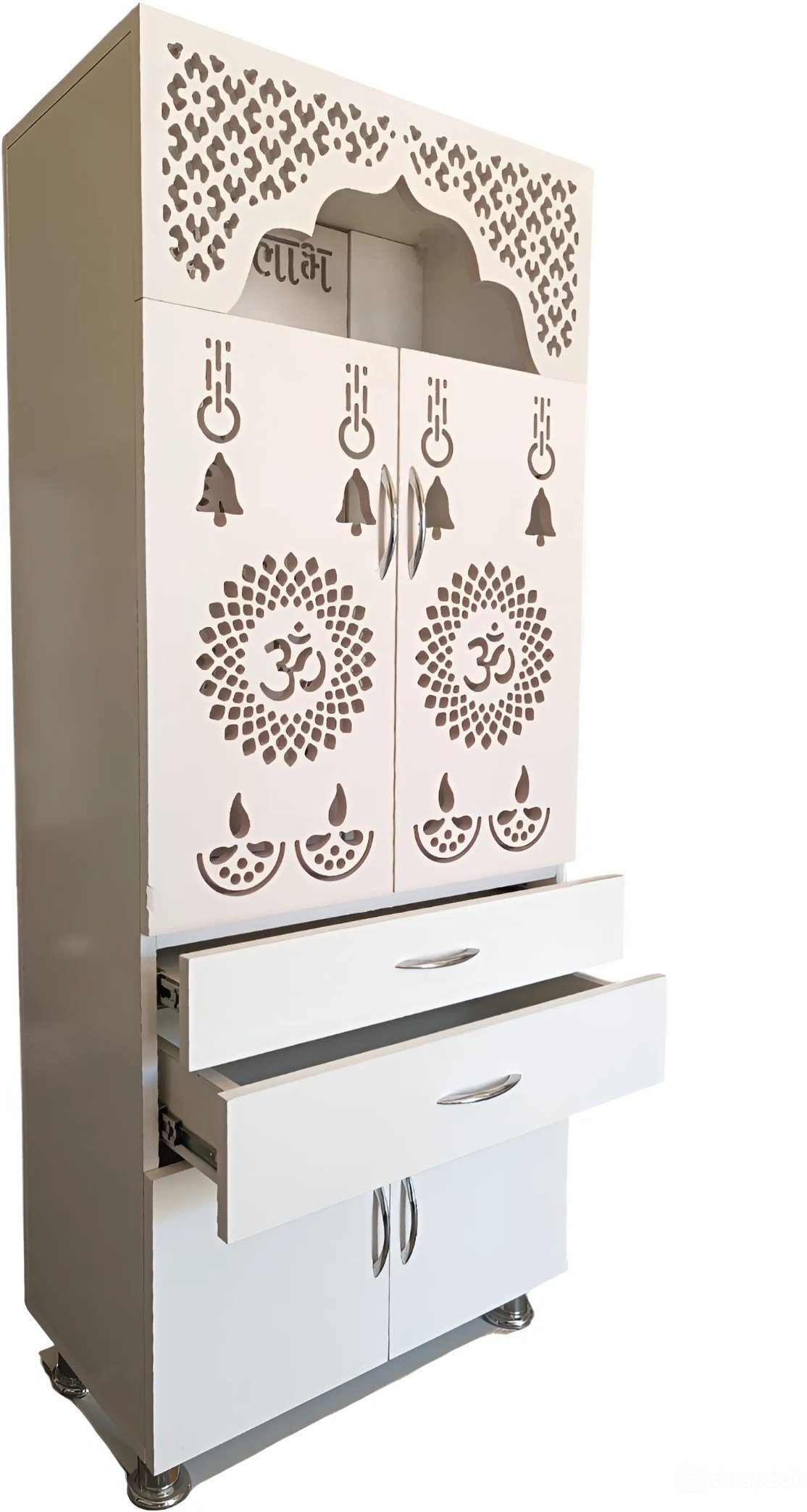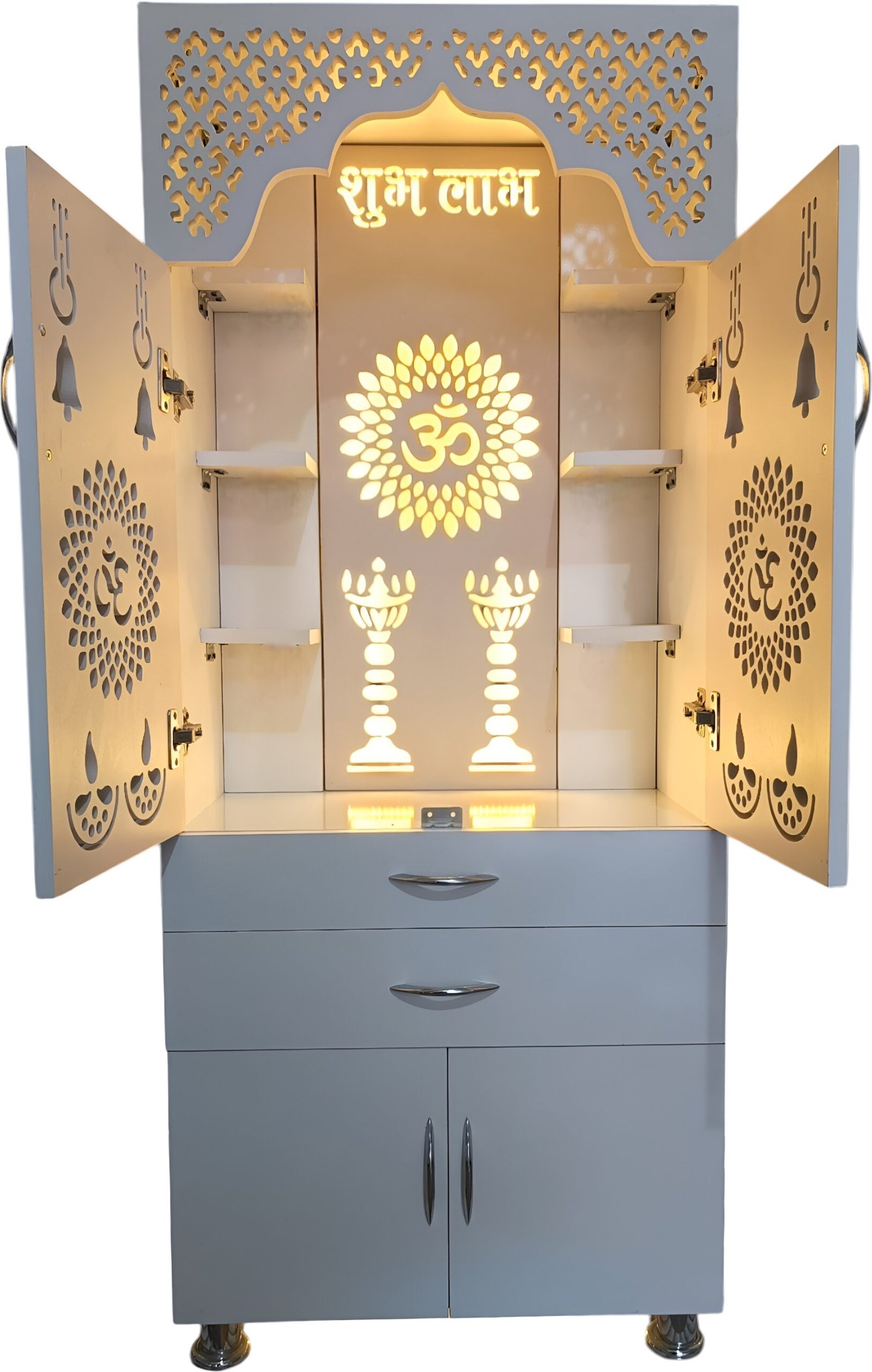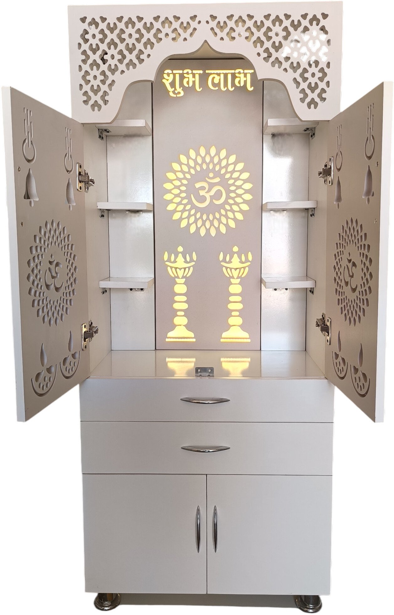 • Drawers: Two wide drawers with sleek metallic handles for storing puja essentials like cotton wicks, matchboxes, and prayer books.