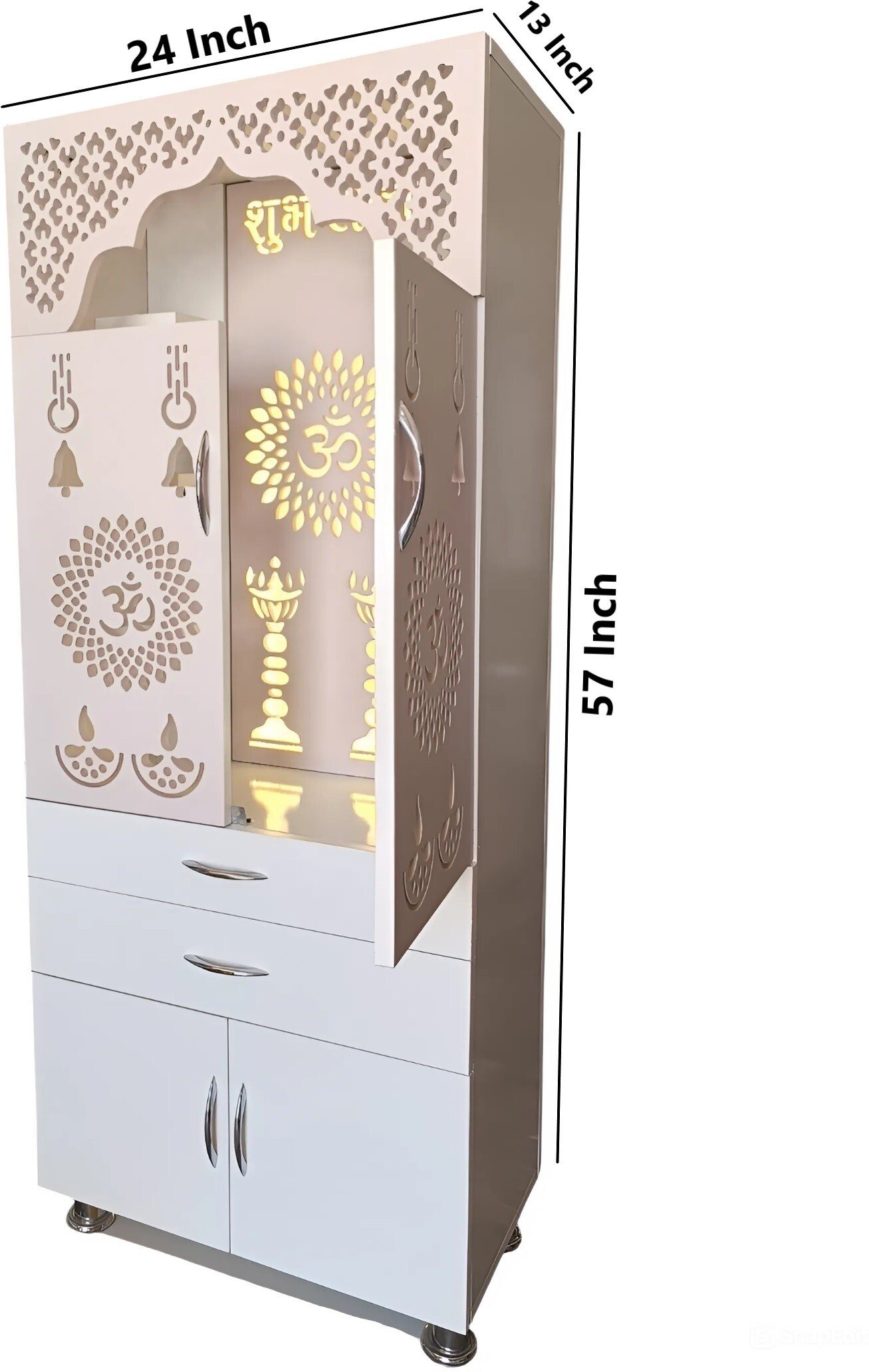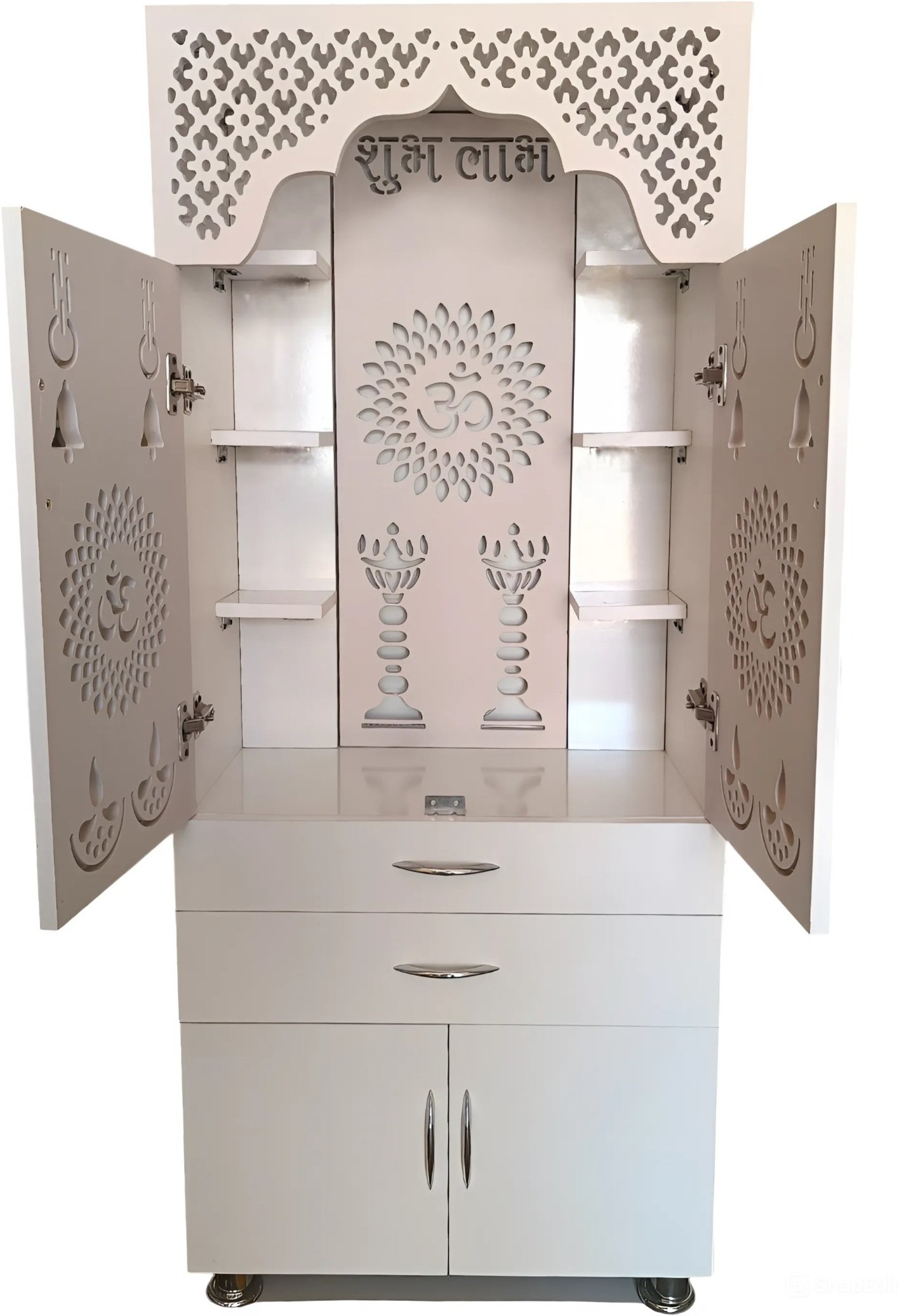 Hindu home mandir (prayer unit), likely crafted from MDF or engineered wood with a matte white finish. It combines traditional spiritual symbolism with modern furniture design.
